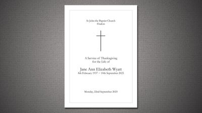 From here you are able to play the video of the service celebrating the life of Jane Ann Elizabeth Wyatt, held on 22nd September 2025 at St John the Baptist Church, Findon.
